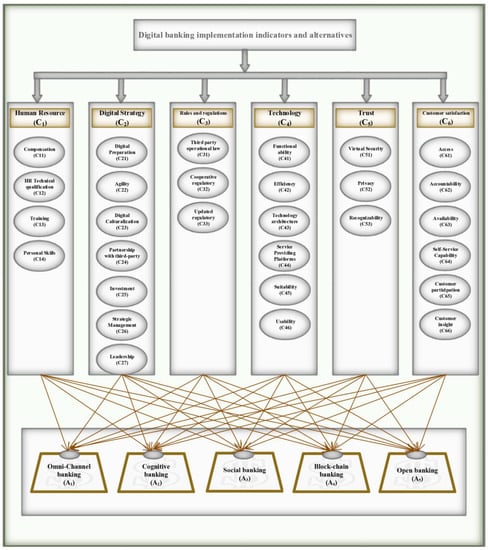 Regarding the identification and prioritization of appropriate criteria for the successful implementation of DB, many research gaps remain. Indicators that take into account various aspects of DB, from customer behavior to technological infrastructure, require a comprehensive literature review, past practical experiences, emerging trends affected by Industry 4.0, expert opinions, and the like. For example, many efforts have been made in India, such as digital marketing campaigns and customer education, to drive customers toward DB, but due to the lack of identification of appropriate criteria for DB implementation and their accurate evaluation, these programs have failed [14]. It is worth noting that the responsibility for implementing DB lies with banks, financial institutions, and policymakers, while the adoption of DB lies with customers and users. While numerous studies have focused on evaluating users’ acceptance of DB, limited research has been conducted to identify and evaluate appropriate criteria for successful DB implementation. To ensure that banks can switch to the DB business model, it is necessary to study the factors affecting the implementation of DB [15]. This study aims to comprehensively identify and evaluate suitable indicators for DB implementation to promote its acceptance among users. Banks and customers view electronic banking services as more convenient and cost-effective than traditional branch-based services, leading banks to move toward providing all services electronically in the future [16]. As a result, identifying and evaluating comprehensive indicators for the implementation of DB and examining efficient models is a crucial research area. This study evaluates these indicators and models based on a literature review, trends influenced by Industry 4.0, service quality theory, and experts’ opinions. The proposed approach considers uncertainty in the decision-making environment and decision-makers’ preferences when evaluating the DB implementation indicators and conventional models.