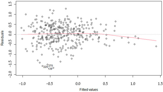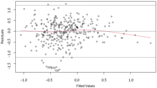 The Breusch-Pagan test on the new model indicated a statistic of 0.1242. Similarly to elimination by the RFPE criterion, the test is unable to provide sufficient evidence to reject the null hypothesis that the error variance is equal at the 0.05 significant level. Figure 4 reinforces the indication as the plot of residuals to the fitted values forms a horizontal band around the y = 0 line. A visual comparison to Figure 2 also does not find significant differences.