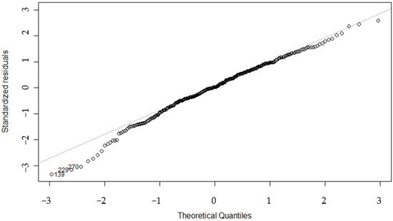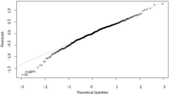 However, the model still fails the Shapiro-Wilks test, as the p-value of 0.0004502 indicates sufficient evidence to reject the null hypothesis that the error is normally distributed at the 0.05 significance level. There is, however, a significant improvement in the statistic in comparison to the model prior to the transformation. The presence of skewness in the distribution of errors is observable from its Q-Q plot, as depicted in Figure 3, wherein a pronounced right tail is apparent. Despite this, several studies have proposed a relaxed normality assumption for large datasets, owing to the Central Limit Theorem. They have suggested sample size thresholds of and where N is the sample size and p is the number of parameters [49,50,51]. The experiment satisfied all of the thresholds with a sample size of 332.