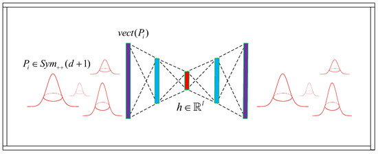 This usually comprises two sections—an encoder that maps the input data into a lower-dimensional representation, and a subsequent decoder that maps the output of the encoder to the same space as the input data. Furthermore, it is usually built to have symmetrical encoder and decoder layers. Namely, if we denote the encoder and the decoder networks by F and G, respectively, where is the size of the input layer, and we supply the vectorized upper triangular of SPD representative obtained by the Lovric embedding [31] of Gaussian component of some GMM in , which is given by: