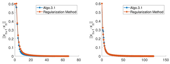 As for the components, both our Algorithm 1 and the regularization method (RM), initial points , are generated randomly by Matlab, inertial coefficient is chosen to satisfy that if , then ; otherwise, , where , , . The experimental results are listed in Figure 1. Moreover, the iterations and convergence rate of Algorithm 1 for different values of are presented in Table 1.
