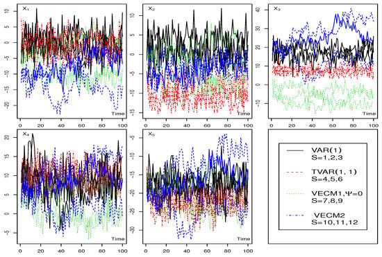 - Lin, J.; Michailidis, G. Regularized estimation and testing for high-dimensional multi- block vector-autoregressive models. J. Mach. Learn. Res. 2017, 18, 4188–4236. [Google Scholar]