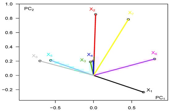 - Loadings based dependenceIn a standard principal component analysis of non-time-series data, the correlation or measure of loadings-based dependence between and is given byIn this equation, is estimated using as defined in Equation (23). The expression of Equation (29) provides the contribution or the weight of each original variable to the calculation of the principal component. This weight can be interpreted as a measure of dependence. The same definition applies directly to time-series data, although the eigenvectors and eigenvalues indirectly incorporate the time structure through the variance–covariance matrix .