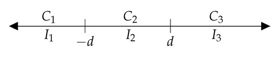 Let n denote the number of the different objects to evaluate and let the number denote the objects themselves. We would like to evaluate (rank and rate) them with the help of the opinions of some persons called observers. We think that every object has a latent random variable behind, . Let the number of the options in a choice be , namely, “worse”, “equal”, and “better”, denoted by , , and , respectively. The set of the real numbers is the union of three intervals, which have no common points. Each option in judgment corresponds to an interval of these intervals. If the judgment comparing i and j is the option , then the difference is situated in the interval The intervals are appointed by their initial points and endpoints, −∞, , d, and ∞, so = (−∞,), = [], and = (d,∞). The above intervals together with the corresponding options are presented in Figure 1.
