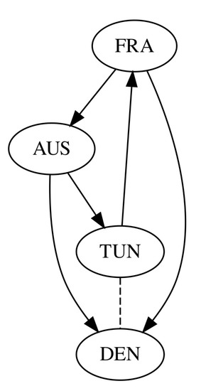 Let us introduce a graph belonging to the results of the comparisons as follows: let be a directed graph, the nodes be the objects, and let there be a directed edge from i to j if there is an opinion according to which i is “better” than j, that is . Now, we can formulate the following conditions:
