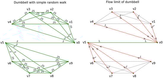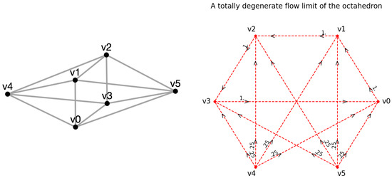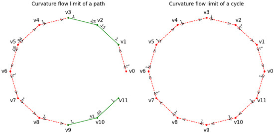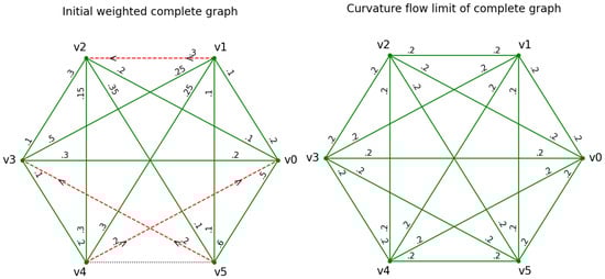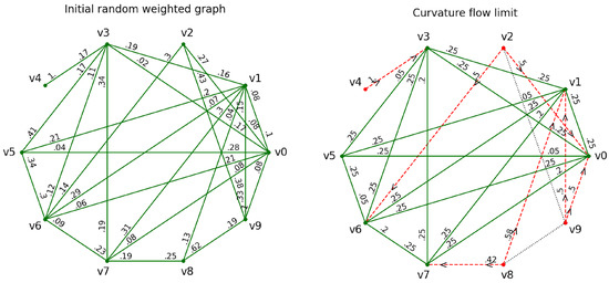 Let us now address some practical aspects of the curvature flow implementation. The Python code is freely available as an ancillary file of [2] or via github at https://github.com/georgestagg/graph-curvature-server (accessed on 6 June 2023). The solution of the curvature flow is computed numerically by the Runge–Kutta (RK4) method, which is based on a time discretization with time increments . In the following examples, we choose the step sizes and . In order to distinguish between the theoretical curvature flow and its implementation, we refer to the latter as the numerical curvature flow. Since a numerical curvature flow cannot run forever, a suitable numerical convergence criterion needs to be introduced. Our convergence criterion is based on the parameter . We say that a numerical curvature flow solution has converged numerically at time t (with respect to the parameter ) if all the entries of differ from the corresponding entries of and by less than . The numerical flow limit is then defined to be . In all the following examples, we set .