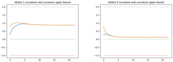 Let us finally consider the curvatures of the vertices under the curvature flow. We focus primarily on the vertices and and the dimension parameter . Figure 3 presents the ∞-curvature (in blue) and upper curvature bound (in orange) of as functions over the interval . Note that the absence of laziness implies that the upper curvature bounds are all (see [1] (19)). For both vertices, the curvature and upper curvature bound functions are numerically asymptotic as , indicating that and of the flow limit are ∞-curvature sharp. (In fact, all vertices in this example are ∞-curvature sharp with respect to the flow limit.) This is not always the case, but Theorem 1 confirms that all vertices of a flow limit are at least N-curvature sharp for dimension . Moreover, the initial and final ∞-curvatures of all vertices under the curvature flow are presented in Table 1. The final curvatures of all vertices in assume the highest values , followed by the final curvature values and of the vertices and , respectively. All other vertices in have much lower final curvatures with values .
