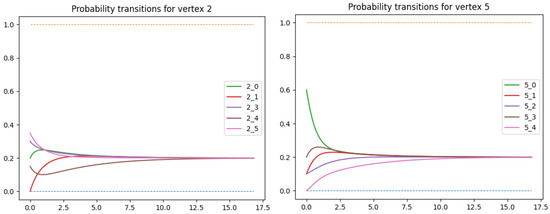 Figure 2 presents the transition rates of the vertices under the curvature flow as functions over the interval . While most transition rates converge to strictly positive limits, the transition rates and shrink to zero. Consequently, the corresponding edges on the right-hand side of Figure 1 are represented by a dashed red line and a black dotted line, respectively.
