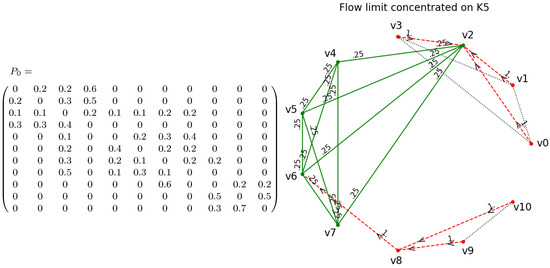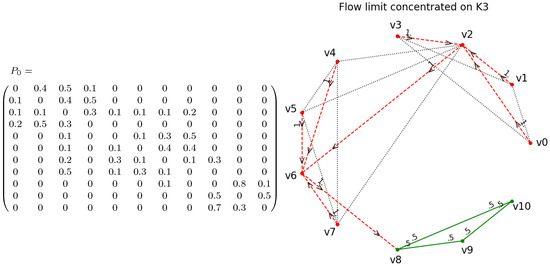 This randomly generated initial graph is illustrated on the left-hand side of Figure 1. The numerical curvature flow of has numerical convergence time (with respect to ). The numerical flow limit is presented on the right hand side of Figure 1. Let us briefly explain the illustration of the edges of this flow limit: Edges with numerical non-zero transition rates in both directions are displayed in green. Edges with only one-sided numerical non-zero transition rates are displayed as dashed red lines with arrows. Edges whose transition rates shrink in both directions numerically to zero under the curvature flow are displayed as dotted black lines. The corresponding non-zero transition rates are written along these edges. The vertices of the green edges of the flow limit in Figure 1 are given by