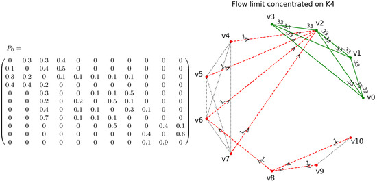 Since there are no numerical non-zero transition rates from these vertices to the other vertices , the vertex set W together with the green edges and their transition rates represent a highly connected non-degenerate Markovian weighted subgraph . The combinatorial graph with vertex set W can be viewed as a double cone over the complete graph of the four vertices with the vertices as its cone tips. The transition rates of the weighting scheme towards all vertices in are , all transition rates towards are and all transition rates towards are . Note that such a weighted double cone over with these transition rates for any choice of satisfying is curvature sharp (this follows readily from the geometric criterion in [1] (Theorem 3.15), since the weighting scheme is volume homogeneous in all vertices and reversible with , and ). Therefore, not only is the flow limit itself curvature sharp in Theorem 2 but also the highly connected non-degenerate weighted subgraph .