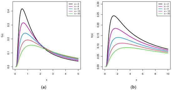 respectively, where and are the shape and scale parameters, respectively. Obviously, when we put , the alpha-PIE distribution is reduced to the inverted exponential distribution by Keller et al. [2]. When we fix and consider different values of , in Figure 1, several shapes for the PDF and HRF of the Alpha-PIE distribution are demonstrated. This shows that the density of the alpha-PIE distribution is unimodal, while its HRF is a monotonically increasing function. Recently, in the presence of complete data, Amjad et al. [3] derived various Bayes estimators of the alpha-PIE parameters and stated that the alpha-PIE model behaved better than the inverted exponential and generalized inverted exponential models.
