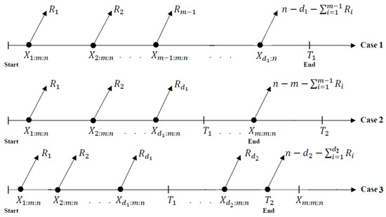 It is critical to note that the GTIIPHC modifies the Type-II progressive hybrid censoring (PHC), proposed by Childs et al. [6], by guaranteeing that the test is completed at the specified time . Thus, is the greatest duration that the examiner is willing to allow the test to continue. Table 1 lists the GTIIPHC notations. Furthermore, from (5), six sampling plans can be introduced and provided in Table 2. A diagrammatic demonstration of GTIIPHC sampling is depicted in Figure 2.