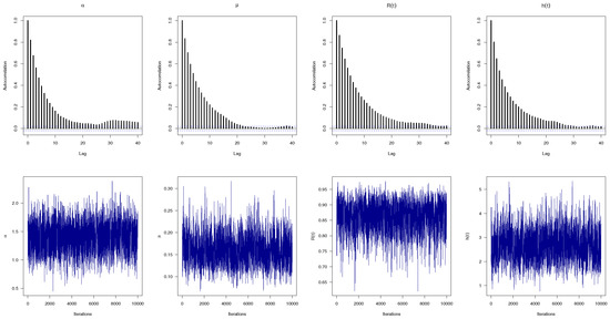 To examine the convergence status of the collected iterations of , , , and developed from the Bayes MCMC algorithm, for Set-1 along with Prior-1, and Scheme-1 as an example, the trace and autocorrelation plots are provided in Figure 3. Obviously, it is evident that the Markovian graphs of , , and are satisfactorily mixed, and thus, the results of the acquired points (or interval) become more significant.