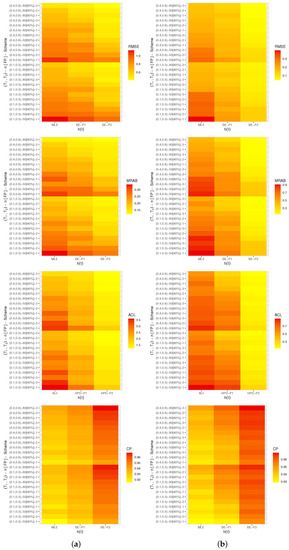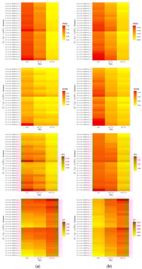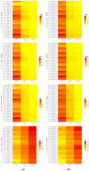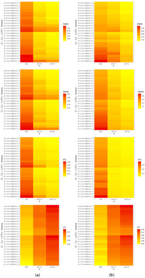 A heat map is a tool for graphically representing numerical data. Via 4.2.2 software with the heat-map programming tool, the calculated criteria (including RMSEs, MRABs, ACLs, and CPs) of , , , and are represented in Figure 4, Figure 5, Figure 6 and Figure 7, respectively. As supplementary materials, all numerical values of , , , or are reported. To distinguish, for each plot in Figure 4, Figure 5, Figure 6 and Figure 7, the proposed approaches are displayed on the ‘x-axis’ line, whereas the censoring settings are displayed on the ‘y-axis’. In addition, as notations, the Bayes estimates (for Prior-I (say P1) as an example) are referred to as BE-P1, while the HPD interval is referred to as HPD-P1.