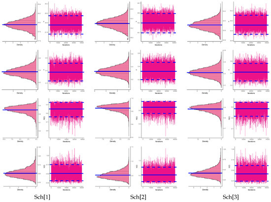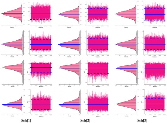 From each sample obtained by (as examples), to display the convergence of 40,000 MCMC draws of , , and , the density and trace pots of all unknown quantities are plotted and shown in Figure 13. This figure supports the same numerical findings reported in Table 10 and indicates that all MCMC iterations of , , or converged satisfactorily. It also shows that the simulated MCMC estimates of and are almost symmetrical, while those of and are negatively and positively skewed, respectively.