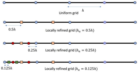 Here, we will first establish a uniform grid and then manually add a few extra grid points very close to the left boundary point. We will use the near-left boundary grid points to initialize the first derivative of the optimal exercise boundary and further compute the optimal exercise boundary and its first derivative after each successive function evaluation stage with the fifth-order Runge–Kutta embedded time integration method based on Dormand–Prince pairs. This implementation will both allow us to use points very close to the left boundary to approximate the optimal exercise boundary and its derivative and enable a locally refined grid in the left corner, where inherent irregularities and variation reside. Here, we delicately add these few grid points in such a way that the points we use for computing the free boundary and the near boundary discrete values are both very refined and equidistant, even though the grid is globally non-uniform. For a description, please see Figure 1. For a similar implementation for solving the options pricing problem with a high-order compact scheme, please see the work of Chen et al. [] and Lee and Sun [].
