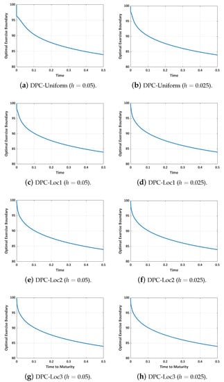 We observe from Figure 2 the importance of the local mesh refinement as it improves accuracy close to the left corner point where and . In Figure 2, for instance, with a uniform grid, when , the optimal exercise boundary is not very smooth close to the payoff. However, with locally refined grids, especially with DPC-Loc2 and DP-Loc3, we observe that the optimal exercise boundary is very smooth with , thus establishing the importance of refining the grid at the left corner point. Moreover, the scheme with a locally refined grid, as shown in Table 4, presents the most accurate result when compared with the one obtained from the uniform grid. Another advantage of the local mesh refinement as presented here is that only a few grid points are introduced while retaining the uniformity of the grid in most regions.
