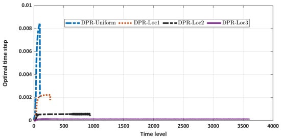 Finally, for this example, to better understand the impact of the grid distribution on the optimal time selection at each time level, we display the time stepping profile based on the uniform and non-equidistant grid distribution in Figure 3 with a step size of and . We observe that the time stepping is very small close to the payoff, which is expected based on the adaptability of our numerical scheme and the inherent irregularity that is more pronounced close to the payoff. Furthermore, we observe from Figure 3 that if we introduce more grid points in the locality of the left corner point, as can be observed from DPC-Loc1, DPC-Loc2, and DPC-Loc3, the time step for a fixed time level is smaller when compared with the uniform space grid distribution. However, from Table 3, we observe that the overall impact on the total runtime is insignificant when compared with the solution accuracy.