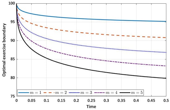 First, we compute the optimal exercise boundary for varying power term 1, 2, 3, 4, and 5, similar to the one presented in Lee’s [] paper, and display the results in Figure 4. We observe that, for a fixed time, the optimal exercise boundary decreases as the power term m increases. This is further reflected in the value of the optimal exercise boundary with varying power term m as presented in Table 15. Our plot also closely resembles the one presented in the work of Lee [].