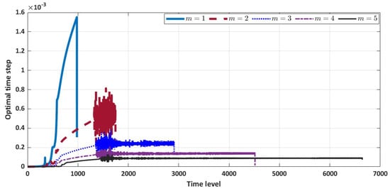 Next, we present the plot profile of the time step versus time level for each considered power term m. The plot is displayed in Figure 5. The optimal time step at each time level decreases substantially as the power term increases. This is expected because of the associated with the diffusive term. This power term m may impact the stability condition if a non-adaptive scheme is implemented.