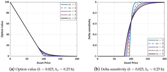 Finally, we display the plot profile and the numerical solutions of the option value and delta sensitivity for each power term m, as presented in Figure 6. For a fixed asset price, Figure 6 shows that the option value increases as the power term m increases. This is also reflected in the numerical solution presented in Table 16. Lee [] describes that this feature given by the exotic options provides the buyer with the possibility of receiving a reasonably higher payoff than its vanilla counterpart. Moreover, in the money, the delta sensitivity decreases as the power term increases. Furthermore, out of the money, delta sensitivity increases as the power term increases. This is fully described in Table 17. Additionally, the numerical solution for gamma at some interpolated grid points is also listed in Table 18.