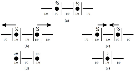 The scalar structure underlying the pentapartition of is visualised in Figure 1a, where the two precise indications of the large fraction for and its complementary small fraction for are represented as two points on the scale, whereas the other three parts of logical space—i.e., , and —are represented as intervals on the scale.