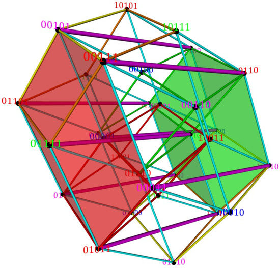 Visually speaking, this deletion operation yields a collapse from the 30 vertices of the rhombic icosahedron (RIH) to the 16 vertices of an embedded hypercube. Figure 3 illustrates the particular case described in Table 2, i.e., for the deletion of . The eight vertices on the (green) right hand ‘cubic’ substructure of the RIH in Figure 3 are precisely decorated by the eight bitstrings from the first column of Table 2, for which = 1. By way of mirror image, the eight vertices on the (red) left hand ‘cubic’ substructure are decorated by the eight bitstrings from the sixth column of Table 2, for which = 0. In other words, this deletion operation eliminates the 14 vertices which are located on the ‘flattened’ RDH structure in the middle of the RIH. Fitting together the vertices of these red and green cubic substructures—as is indicated by means of the extra thick (magenta) edges through the center in Figure 3—yields the 16 vertices of an embedded hypercube.