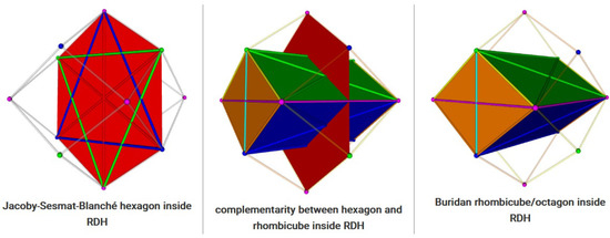 Visually speaking, the six different ways to collapse two bit positions in correspond to the well-known embedding of six Jacoby–Sesmat–Blanché (JSB) hexagons inside the RDH [1]. Furthermore, the complements of these six hexagons are polyhedra with eight vertices, which are called rhombicubes and which—from an Aristotelian perspective—are Buridan octagons [11]. The diagram in the middle of Figure 4 illustrates this relationship of complementarity between the JSB hexagon on the left and the Buridan rhombicube on the right.