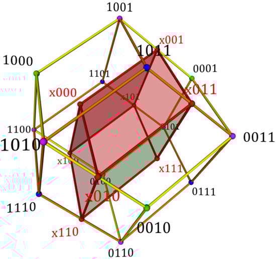 Now the collapse from to can take place in two directions: in columns one and four of Table 1, the two identical values collapse to the left position of while ‘disappears’, whereas in columns three and six, they collapse to the right position of while ‘disappears’. Both directions of collapsing—columns 1/4 versus columns 3/6—yield the same set of 14 non-trivial bitstrings of length 4, corresponding to the 14 vertices of the RDH. In other words, this type of collapsing operation does not lead to the reappearance of the trivial top and bottom elements 1111 and 0000 of .