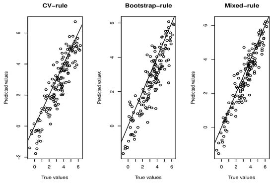 Figure 4 shows that performed better in terms of the prediction results compared to . Even though both predictors had good behavior, the ASE of the relative regression (2.09) was smaller than the classical regression, which was equal to 2.87.