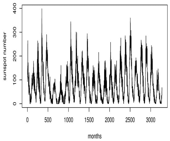 We devote this paragraph to the real application of the RE-regression as a predictor. Our ambition is to emphasize the robustness of this new regression. To do this, we compared it to the classical regression defined by the conditional expectation. For this purpose, we considered physics data corresponding to the monthly number of sunspots in the years 1749–2021. These data were available at the website of WDC-SILSO, Royal Observatory of Belgium, Brussels, http://www.sidc.be (accessed on 1 April 2023). The prediction of sunspots is very useful in real life. It can be used to forecast the space weather, assess the state of the ionosphere, and define the appropriate conditions of radio shortwave propagation or satellite communications. It is worth noting that these kinds of data can be viewed as a continuous time process, which is the principal source of a Hilbertian time series by cutting the continuous trajectory into small intervals with fixed larger intervals. To fix these ideas, we plotted the initial data in Figure 3.