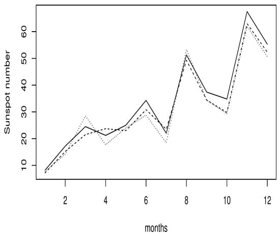 Thus, our objective was to predict , knowing and . At this stage, was the predictor of . In this computational study, we aimed to forecast the sunspot number one year ahead, given the observation of the past years. Thus, we fixed on month j in 1, …, 12, and computed the estimator by the sample , with as the sunspot number of jth months in the th year, and we repeated this estimation procedure for all .