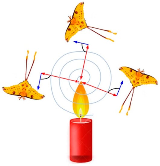 The real inspiration that is derived from nature in order to achieve the optimized solution is nothing but the transverse orientation-based moth’s navigation method. Under darkness, during the night, with respect to the direction of flight, moths fly in a specific direction by keeping a fixed angle, as shown in Figure 2. This is an efficient technique for moths to move long distances in a straight line. While moving long distances, these insects face trouble following the artificial lights. They usually get trapped in a spiral path while traveling under artificial lights, as depicted in Figure 3. The moths, which act as the search agents, move close to search space, and the flame’s best position is updated using the moth’s best position obtained in search space.