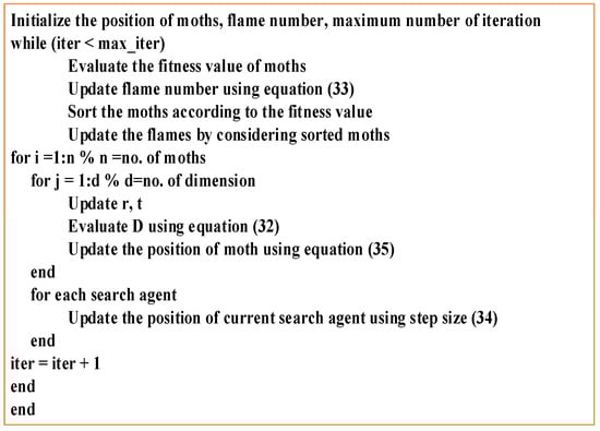 Exploitation and exploration are two main parts of an optimization algorithm. In addition, randomization plays a dynamic role in the algorithm. In a normal scenario, MFO updates its search agents towards candidate solutions. The effectiveness of the MFO [38] technique is indubitable, concerning the period of computation where it converges to the optimum values. Yet the process of searching may be lethargic. So, for improving the rate of convergence of the MFO technique as well as finding the global optimum solution, an enhanced searching process is depicted here [43], like the adaptive cuckoo search technique. Figure 4 shows the pseudocode of the modified MFO approach, i.e., MMFO.