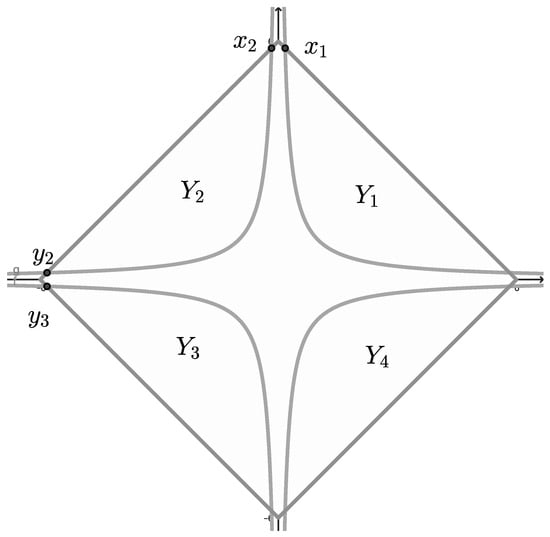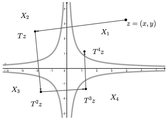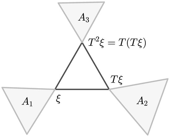 The points , , and are the unique fixed points for the map in , respectively (Figure 8).