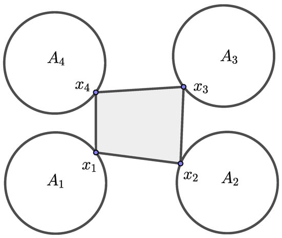 We will try to provide a contractive condition so that is equal to a constant depending on the sets , , for a unique , to hold , and whenever the sets are of the kind from Figure 4 or Figure 5, the investigated mapscoincide with the p–cyclic contractions or p–cyclic summing contractions, i.e., in this case, the point is a best proximity point of T in in the sense of [2,30].