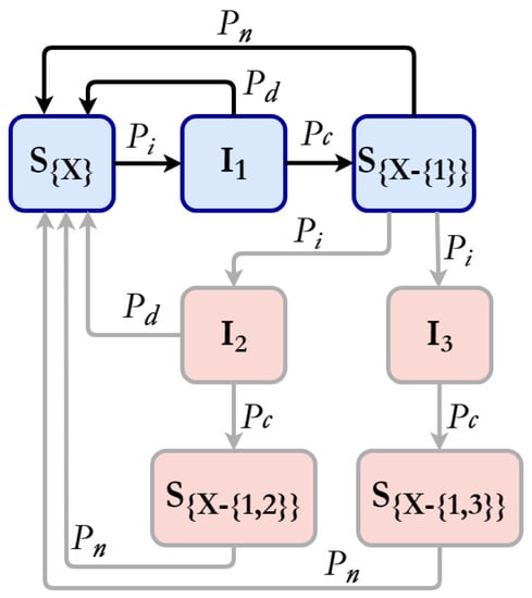 The probability of individuals becoming infected is a function of their neighborhood. Each individual is connected to C neighbors located within a Moore radius r per time step. The neighborhood alters at each time step, with C connections being randomly established using the following procedure. An individual has a likelihood of establishing a connection to a cell in layer i, with the probability . By layer i, consider the cells that are at a Chebyshev distance of i. A random cell from this layer is selected, and C connections are established. Subsequently, the number of infected neighbors determines the probability of an individual being infected, given by , where k is a parameter associated with the disease’s infectivity. This approach has been employed in several previous works, such as [22,23,31]. When multiple disease strains are present in the population, the number of infected neighbors is counted separately, and the likelihood of becoming infected with each disease type is determined randomly to prevent any prioritization. It is assumed that an individual may only contract one strain of the disease at a time.