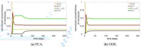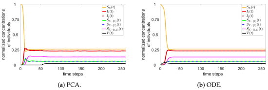 For two variants, a PCA simulation is run with , , , , , , , and vaccinations per time step (from time step ). From PCA, the ODE approach with two variants is simulated using the constant rates from Equation (9). Figure 3 contains the time evolution of the PCA and ODE approaches.