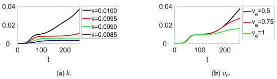 Prior to analyzing the impact of mutations, Figure 4 presents the temporal evolution of the normalized cumulative deaths resulting from the disease, as a function of two key variables, k and vaccine efficacy (Figure 4a and Figure 4b, respectively). The vaccine efficacy utilized in all subsequent simulations is fixed at 100%; nevertheless, this figure enables consideration of two additional scenarios corresponding to lower vaccine efficacies. It is noteworthy that as k increases, so does the total number of deaths. The increase in deaths from to highlights how even a minor increase in k may significantly impact disease transmission as a result of increased mutational frequency. The simulations were executed under the conditions of vaccinations per time step, , , and , except where indicated otherwise.