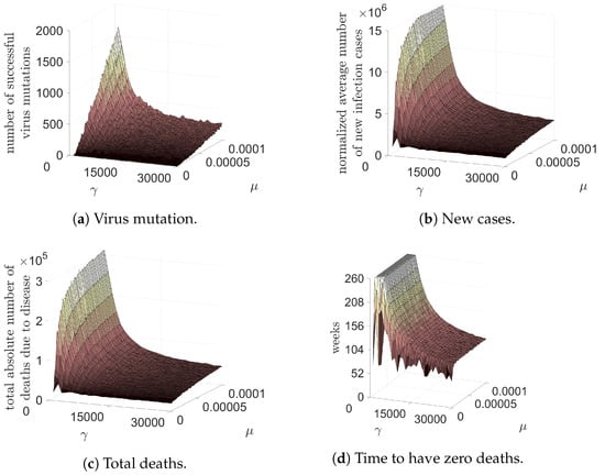 Four variables in function of the mutation rate of the SARS-CoV-2 and vaccination rate: the number of successful virus mutations; normalized average number of new infection cases per time step after five years from the beginning of pandemic; total number of deaths in five years; and the time, in weeks, to have zero deaths due to COVID-19 pandemic.