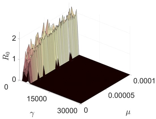 If we assume that a single time step of the simulation corresponds to one week of real time, and if the average duration during which an infected individual can spread the virus is roughly three weeks, we can estimate the probability of cure as . Additionally, we consider the probability of an infected individual dying from COVID-19 as 1%, denoted as [34,35,36]. Given the life expectancy of Brazil, which is approximately 76.3 years [37], we assume . To achieve an value within the range of , we adjust the values of , , and [36,38,39].