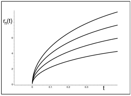 Here, and are suitable real and smooth functions of time t. Thus, for illustration we may choose the shift , the dimension and the parameter . This would yield the spectrum as displayed in Figure 1. We may see that the model is “realistic” in the sense that at any quantum number n our toy-model empty Universe exhibits a point-like singularity (Big Bang) at and a quick expansion at .