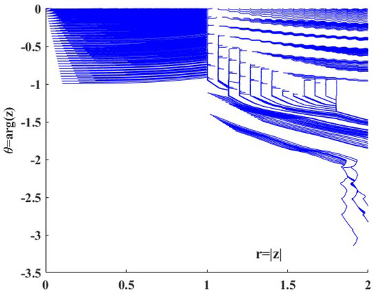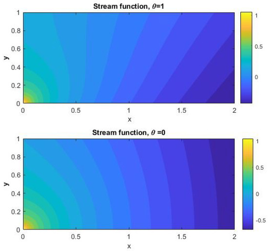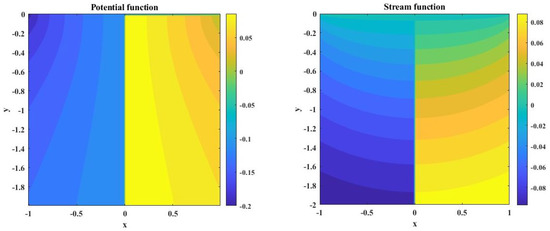 In the vicinity of the points and the speed suddenly changes direction and becomes infinite. To visualize this, in Figure 7 the streamlines of the velocity on the dependence of and are plotted, which describe part of the half-plane. Also, for the same case, the potential function and stream function are depicted in in Figure 8.