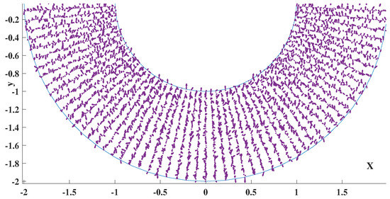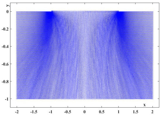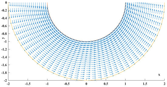 In Figure 6, for water infiltration under a dam with segment as an impermeable base, the velocity field for parameters is presented.