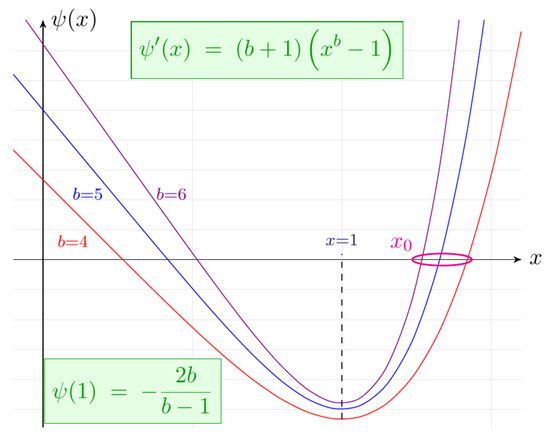 Figure 2 provides a visual illustration of the behavior of for different values of b, highlighting the existence and uniqueness of .