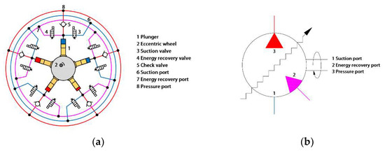 The structure and components of the DERDP with five plungers are shown in Figure 1a. It can be seen that DERDP is mainly composed of a plunger pair, eccentric wheel, and flow distribution valve groups and has three oil ports, such as suction port, energy recovery port, and pressure port. The eccentric wheel driven by a motor rotates and pushes the piston to achieve the reciprocating motion, which makes the volume of the sealed plunger chamber formed by the plunger pair change. Each plunger pair is equipped with a flow distribution valve group that includes a suction valve (SV), an energy recovery valve (ERV), and a check valve (CV). When the SV is energized, the corresponding sealed plunger chamber has a direct connection to the suction port, thus hydraulic oil can flow freely between the sealed plunger chamber and the tank pass through the suction port. By opening the ERV, the external high-pressure oil runs through the energy recovery port and enters the sealed plunger chamber. The plunger is forced to move and help the eccentric wheel work under high-pressure oil, which realizes the direct recycling of hydraulic energy. The CV connecting to the pressure port is used to prevent the high-pressure oil of the hydraulic system from flowing into the sealed plunger chamber. For the convenience of application, the Simplified graphic symbol of DERDP is defined in Figure 1b.