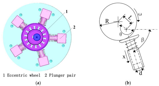 The five plungers of the radial plunger pump are uniformly distributed along the circumference of the eccentric wheel, as shown in Figure 2a. As these plungers are completely consistent, the whole radial plunger pump is simplified as the reciprocating motion of one plunger under the eccentric wheel. The major parameters of the eccentric wheel and plunger pair are annotated in Figure 2b.