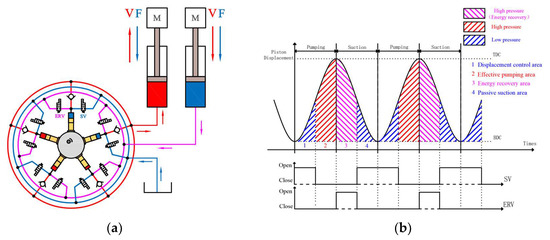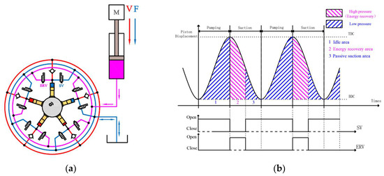 The working principle of DERDP in energy recycling mode is s shown in Figure 5a. Compared with PM, the energy recovery port is employed to import the hydraulic energy that is transformed from the potential energy of the load, while the pressure port is idle. The imported hydraulic energy enables the plunger and eccentric wheel to move, which achieves the goal of the hydraulic energy recovery. The Figure 5b reveals the control method of these two valves in the process of energy recovery. When the plunger is at the pumping stage, the SV has been put on opening and the sealed plunger chamber is in a state of low pressure. When the energy recovery function of DERDP is in demand and the plunger enters the suction stage, the ERV is turned on. At the opening moment of the ERV, the SV is closed as quickly as possible to raise the pressure of the sealed plunger chamber. That is, the SV and ERV cannot keep open at the same time. To sum up, DERDP in energy recycling mode is similar to a digital hydraulic motor. The variable displacement of the ‘motor’ is completed by adjusting the opening time of the EVR.