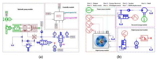The DERDP investigated in this paper has five identical plunger modules and therefore, the foundation and core of the entire pump is the modeling of the single plunger module that is shown in Figure 7a. The AMESim model of the single plunger module includes two main parts: a hydraulic plunger part and a controller part. The hydraulic plunger part is established for the simulation of the plunger pairs, eccentric wheel, and flow distribution valve group. Judging by various operating conditions, the controller part is used to generate the control signals for the SV and ERV. On the basis of the single plunger modeling, the performance simulation test system for the DERDP is accomplished as shown in Figure 7b. This system is composed mainly of a power source module, DERDP module, load module, and recovered energy module. In the load module, a proportional relief valve is controlled to regulate the working pressure of the DERDP. A hydraulic power source with adjustable pressure in the recovered energy module is designed to offer the outside hydraulic energy to the DERDP when the energy recycling and direct reuse modes are utilized. The parameters of the DERDP model are entirely consistent with the experimental prototype that is reconstructed from a radial plunger pump, as listed in Table 1.