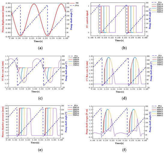 Simulation results of DERDP in PM with the different PDF: (a) Piston displacement; (b) SV control signal; (c) flow rate of SV; (d) flow rate of CV; (e) piston chamber pressure; (f) Pump shaft torque.